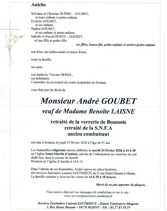 1. C’est avec une immense tristesse que j’ai appris la disparition de votre papa, grand père et arrière grand père. Je garderai de lui et de votre maman de mémorables souvenirs gravés à jamais dans mon coeur, veuillez accepter mes plus sincères condoléances.