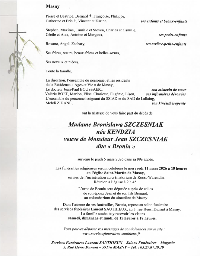 Suite au décès de ma tante Bronia, nous vous adressons nos sincères condoléances et vous souhaitons beaucoup de courage en ces moments difficiles.
