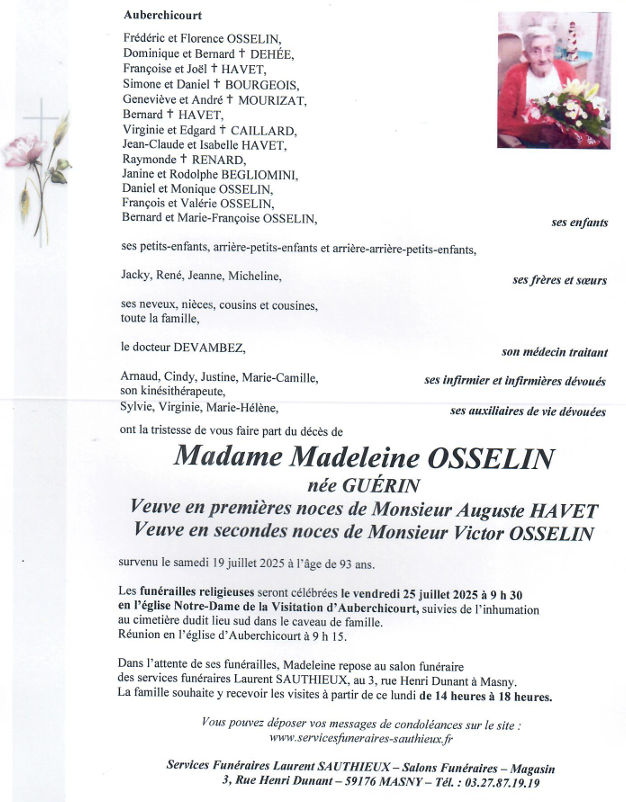 Nous vous présentons nos sincères Condoléances pour le décès de madeleine