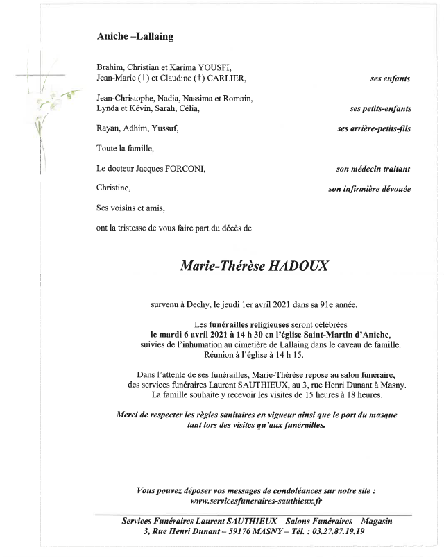 Une grosse pensée pour ma voisine marie Thérèse une damme très gentil nous présentons nos sincère condoléances à la famille courage dans cette épreuve dificil . Reposer en paix marie Thérèse vos voisin du 3 place de la Rochelle